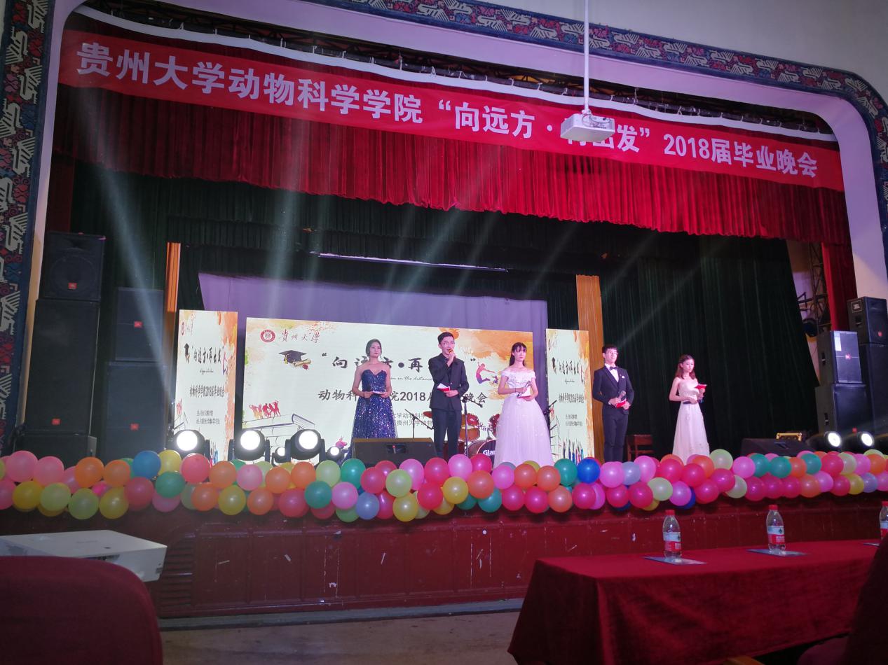 为激发毕业生怀揣梦想,扬帆远航,服务社会,表达对毕业生的祝福,2018年6月19日晚,贵州大学动物科学学院在北校区大礼堂举行“向远方.再出发”2018届毕业晚会。贵州大学学生工作部(处)副处长于松,贵州大学动物科学学院党委书记任登鸿,党委副书记李秋蓉及学院各班班主任老师等代表出席本次晚会。