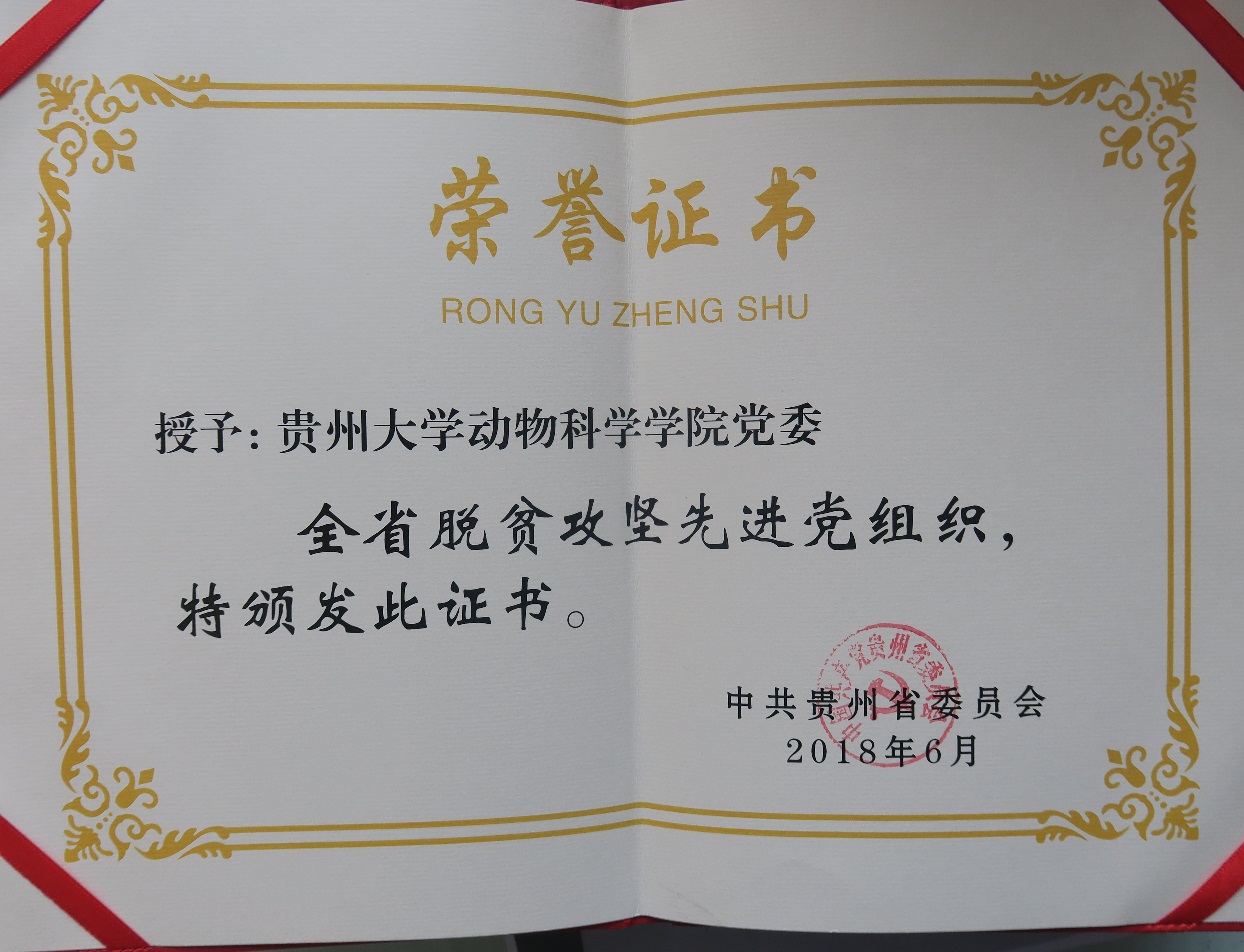 2018年7月1日上午9时,贵州省脱贫攻坚“七·一”表彰大会成功在贵阳举行。大会表彰了全省脱贫攻坚优秀共产党员、优秀党组织书记、优秀村第一书记、先进党组织。贵州大学动物科学学院党委荣获“脱贫攻坚先进党组织”称号。