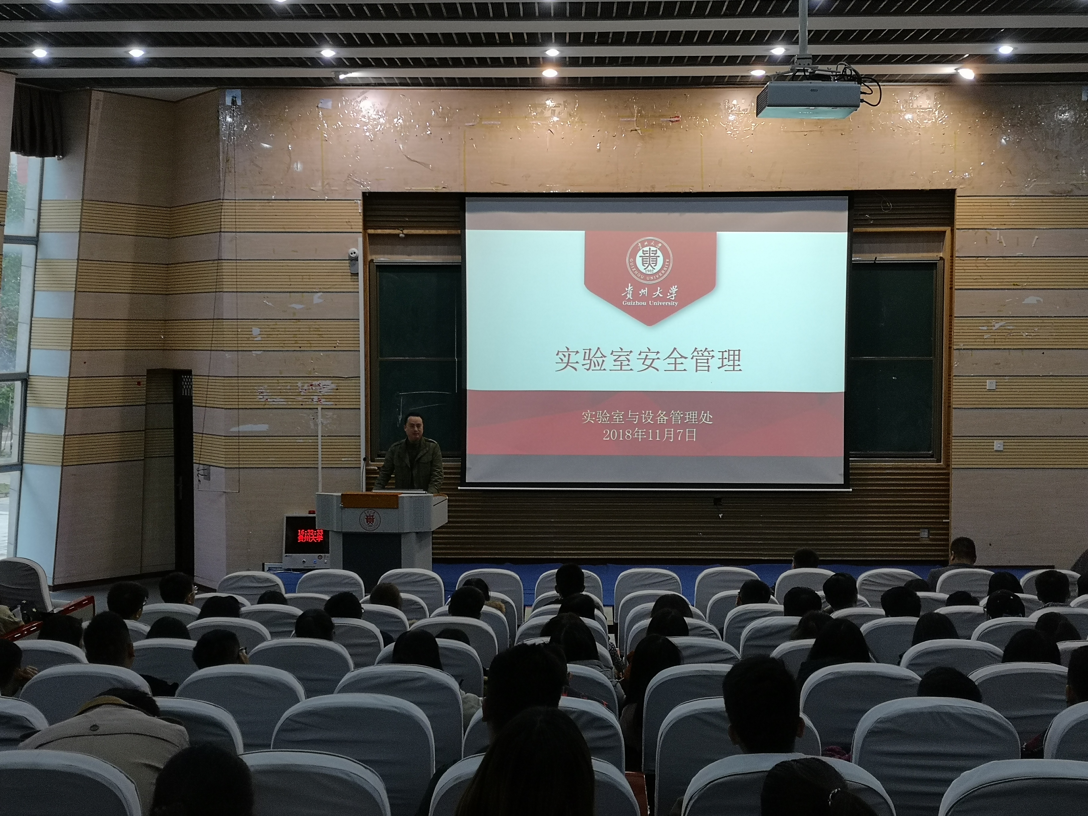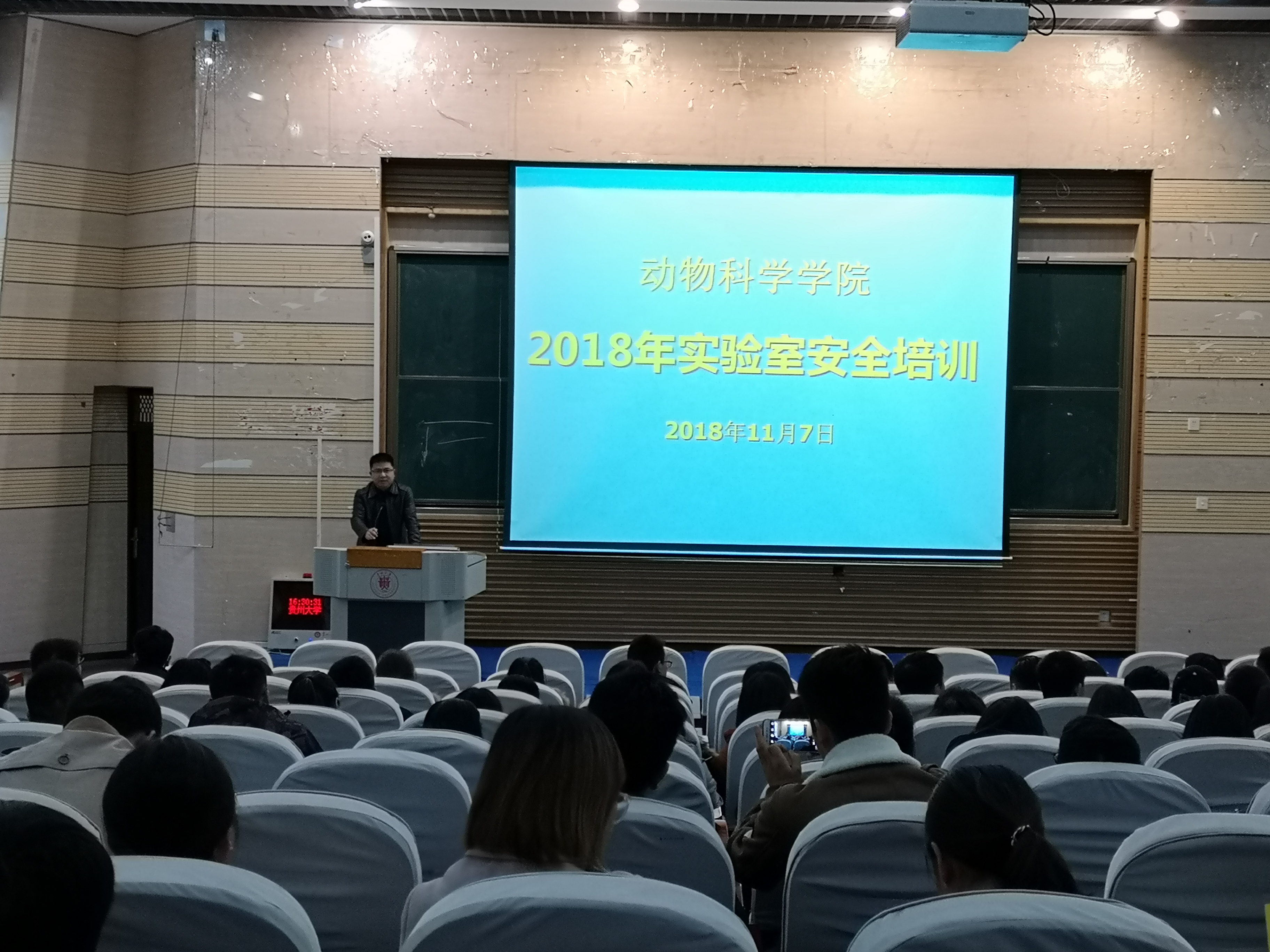 2018年11月7日下午,动物科学学院在西校区西楼117DT圆形报告厅,举办2018年实验室安全培训会。贵州大学实验与设备管理处副处长宋强出席培训会并进行实验室安全培训。会议由动物科学学院副院长陈超主持,学院全体教师和2016、2017、2018级全日制研究生,共计200余人参加培训会。