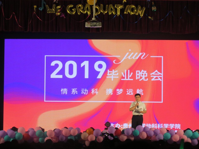6月12日晚上19:00,贵州大学动物科学学院在东校区大礼堂举办“情系动科·携梦远航”2019届毕业晚会。学院党委书记谭诗信、副院长(主持工作)陈超、党委副书记李秋蓉出席晚会现场,学院部分老师与学生近900人观看了晚会。南京农业大学等12所兄弟学校、生命科学学院等21个兄弟学院纷纷为晚会送来贺信或祝贺视频!