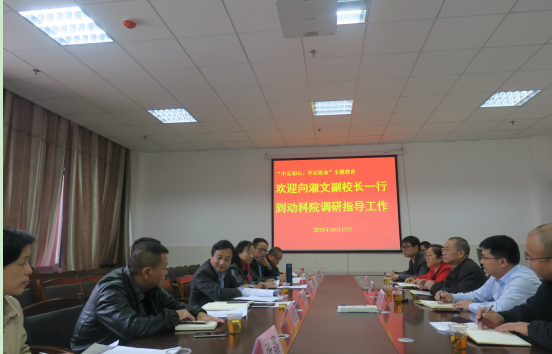 10月17日,为践行"不忘初心,牢记使命"主题教育,向淑文副校长率领教务处陈祥盛处长、招生就业处惠淑林处长及实验农场场长董永刚、教务处副处长林益、教务处副处长张晶、教务处副处长曾湘黔、教务处副处长黎应飞一行到我院调研指导工作。下午3点在崇学楼206会议室召开了座谈会。我院谭诗信党委书记、陈超副院长(主持工作)、李秋蓉副书记以及各系主任、副主任、重点实验室负责人等30余人参加了座谈。