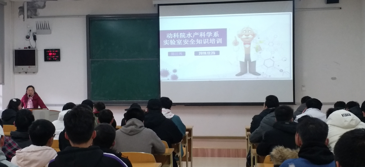 2019年12月25日上午,我院水产科学系在明俊楼115D举办实验室安全培训会,实验教师陈江凤进行实验室安全知识培训,水产科学系全体研究生和大四本科生共计70余人参加培训会。会议由水产科学系副主任周贤君主持。