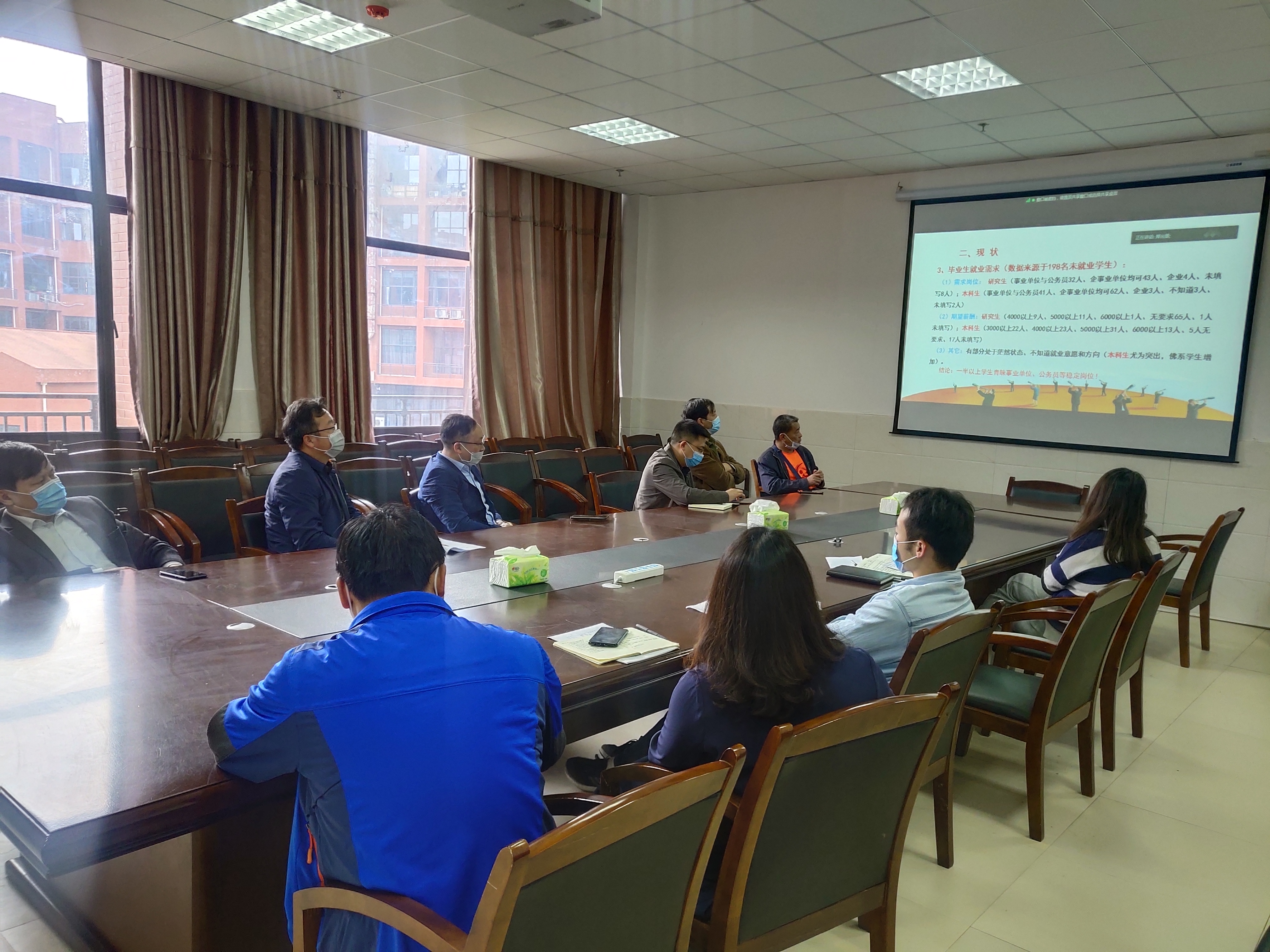 党委副书记李秋蓉在会上作《2020届毕业生就业工作分析及对策》报告,对2020年毕业生就业工作背景、现状、存在的问题进行分析,并提出了“主动关怀、坚持教育、分类指导和发挥优势”等对策。
