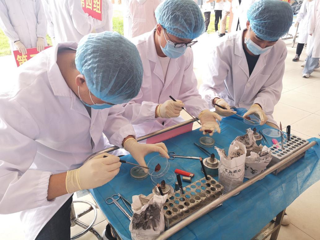 本次技能竞赛,在动物医学专业2017级同学组成的11支队伍间展开,每组3名成员分工协作完成比赛各环节。竞赛项目包括药物注射技术、动物采血技术、动物解剖和组织样本采集、细菌分离培养技术、细菌革兰氏染色镜检技术、病理切片的观察与认知、组织切片的观察与认知等动物疫病诊断与防治专业技术等内容。