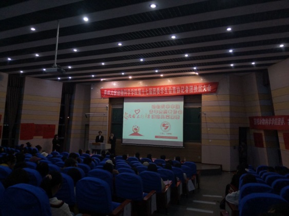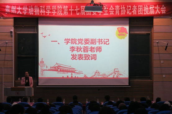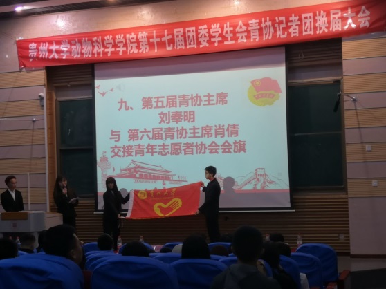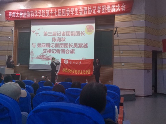 2020年10月19日晚上,我院第十七届团委学生会、第六届青年志愿者协会与第四届记者团换届大会在贵州大学西校区东楼117DT圆形报告厅举行。院党委副书记李秋蓉、学生辅导员黄其河老师出席大会;第十六届团委学生会、第五届青年志愿者协会、第三届记者团成员,第十七届团委学生会、第六届青年志愿者协会、第四届记者团全体成员,兄弟院校代表及学院各班级学生干部代表参加了换届大会。