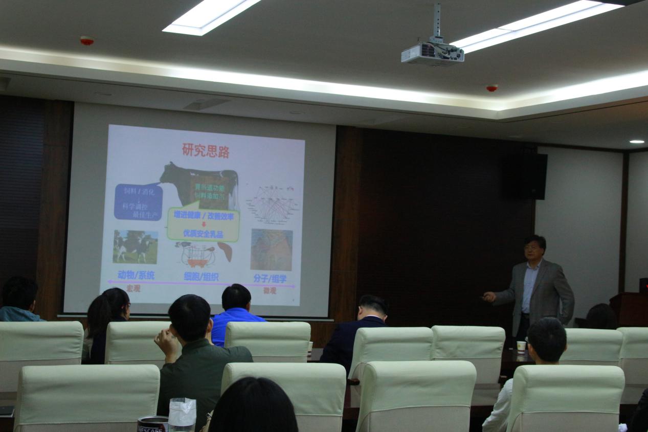 10月27日,双方举行了座谈会。我院副院长陈祥教授代表学院对刘建新教授一行来访表示衷心感谢,介绍了动物科学学院的历史沿革、发展现状、存在问题及下步措施,表示希望得到刘建新教授的帮助,搭建起动物营养与饲料科学学科平台,不断发展壮大。刘建新教授介绍了浙江大学动物科学学院的发展历史与学科现状,表示乐意为两校(院)继续开展学术交流及为我院学科发展贡献力量。随后,刘建新教授与王迪铭副教授分别以《奶牛营养研究进展与思路》与《从动物试验设计到论文写作-案例分析》为题与大家分享了学术报告。报告会由我院动物营养学吴文旋教授主持,吸引了100余名师生到场聆听,现场气氛热烈。刘建新教授与王迪铭副教授还耐心细致回答了现场提问。10月28日,吴文旋教授陪同刘建新教授一行参观了我院科研养羊示范基地。