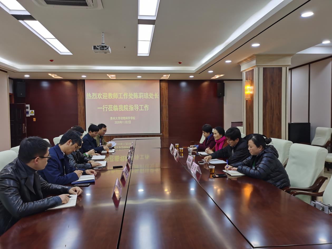 11月2日下午在崇学楼324会议室,学校教师工作处陈莉琼处长率班子成员——周长峰副处长、梁方毅副处长、王琪副处长一行莅临动物科学学院调研指导。学院党委书记罗聃宁、副院长(主持工作)陈超、副院长陈祥、各系主任及青年教师代表等参加了本次座谈会,陈超主持会议。