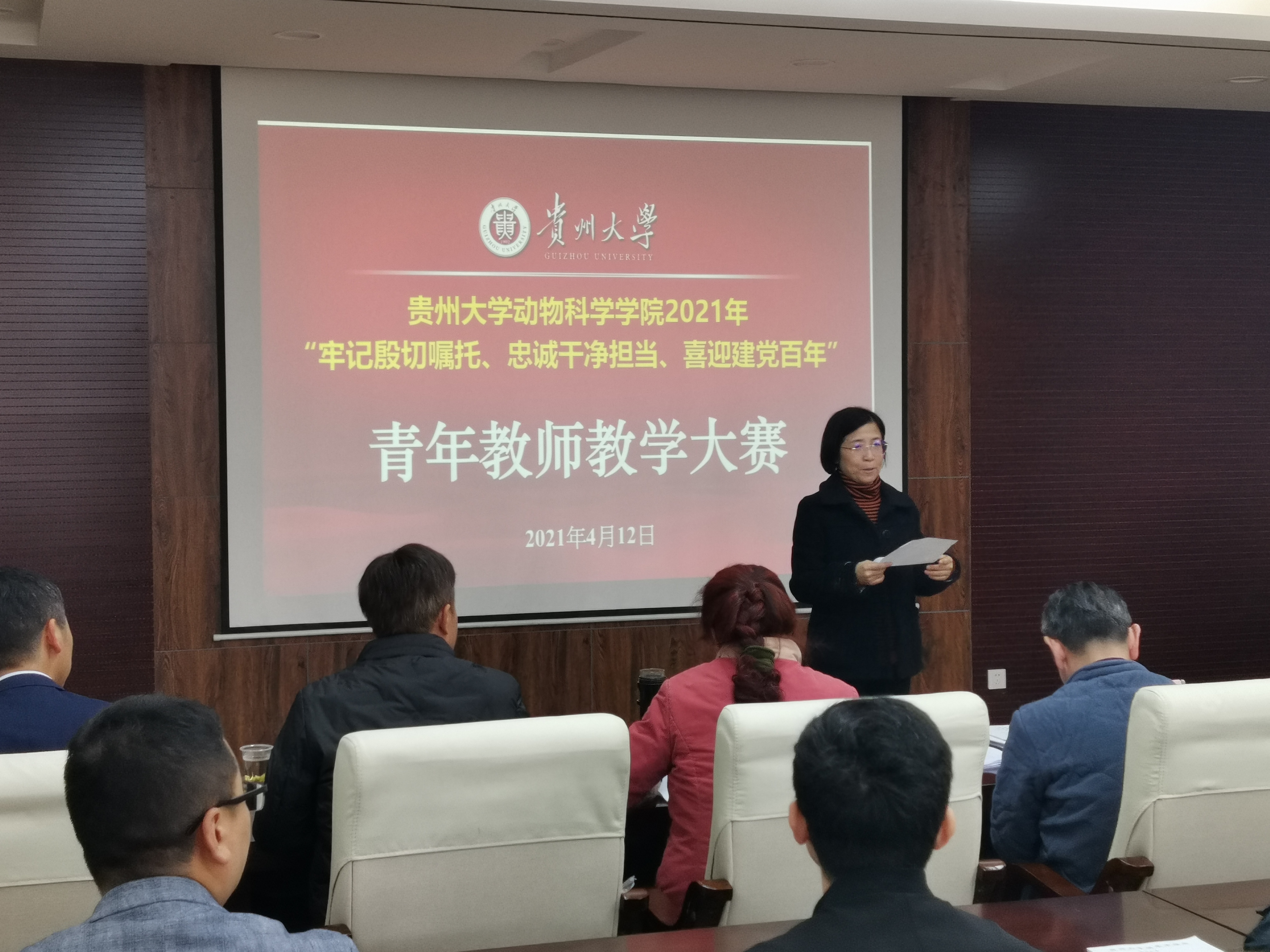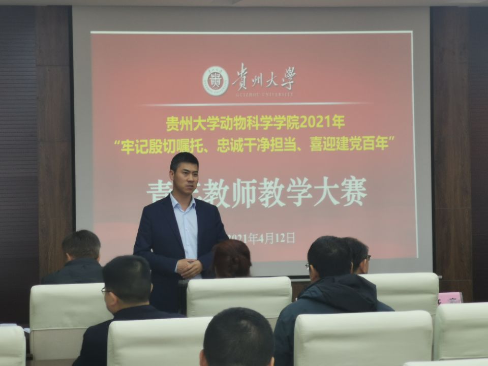 为深入贯彻落实习近平总书记视察贵州时的重要讲话精神,加快推进我校部省合建和“双一流”建设步伐,按照《贵州大学开展“牢记殷切嘱托、忠诚干净担当、喜迎建党百年”专题教育实施方案》之重落实、办实事的要求,为提高学院教育教学质量,提升学院一流本科专业建设水平,锤炼青年教师教学基本功,提升广大青年教师的教学业务能力,2021 年4 月12 日上午9:00, 我院在崇学楼324举办“牢记殷切嘱托、忠诚干净担当、喜迎建党百年”2021年青年教师教学大赛。大赛由学院分管教学的副院长陈祥教授主持。学院领导及各系教研室主任及青年教师均到现场观看了此次大赛。