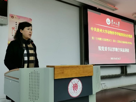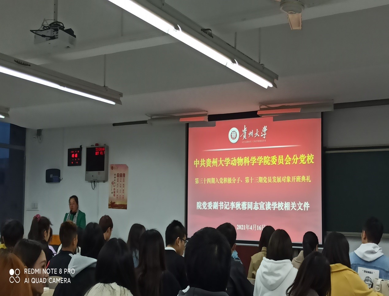 2021年4月16日晚18:30,中共贵州大学动物科学学院委员会分党校在西楼409教室举行第三十四期入党积极分子、第十三期党员发展对象培训班开班典礼。学院党委书记罗聃宁、副书记李秋蓉、组织员赵桂溶及培训班学员120余人参加典礼,典礼由赵桂溶主持。