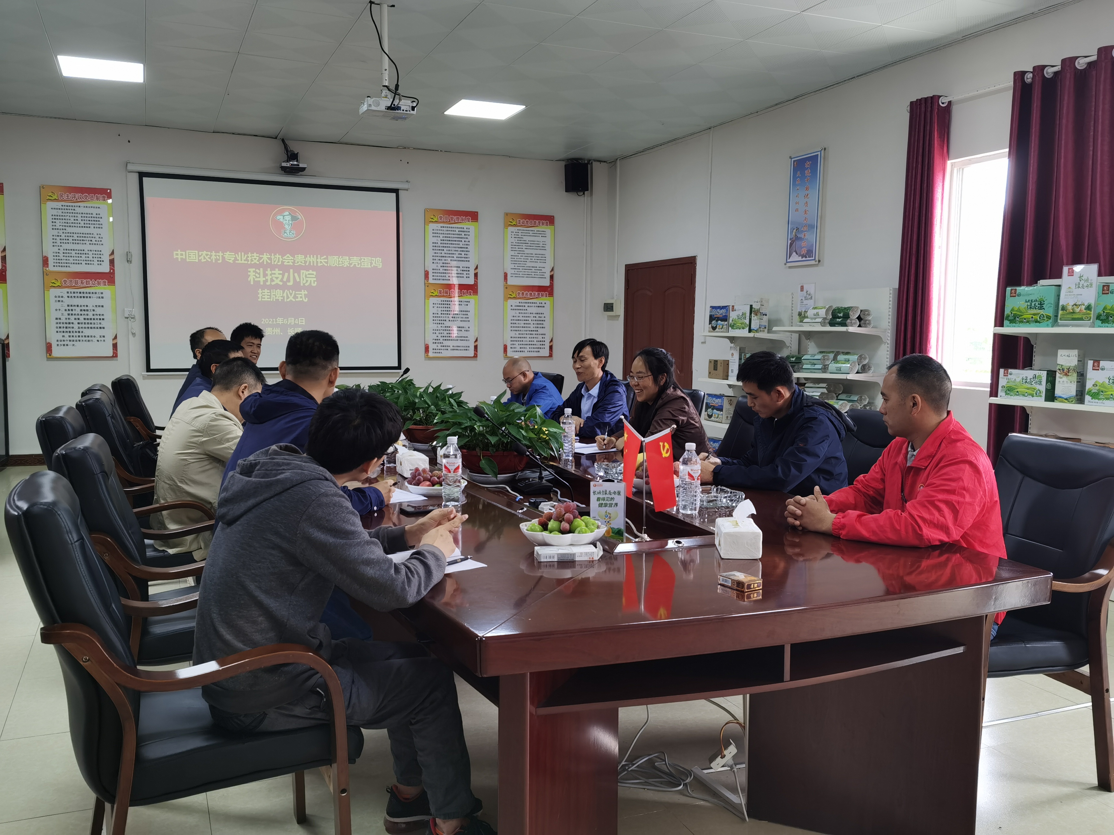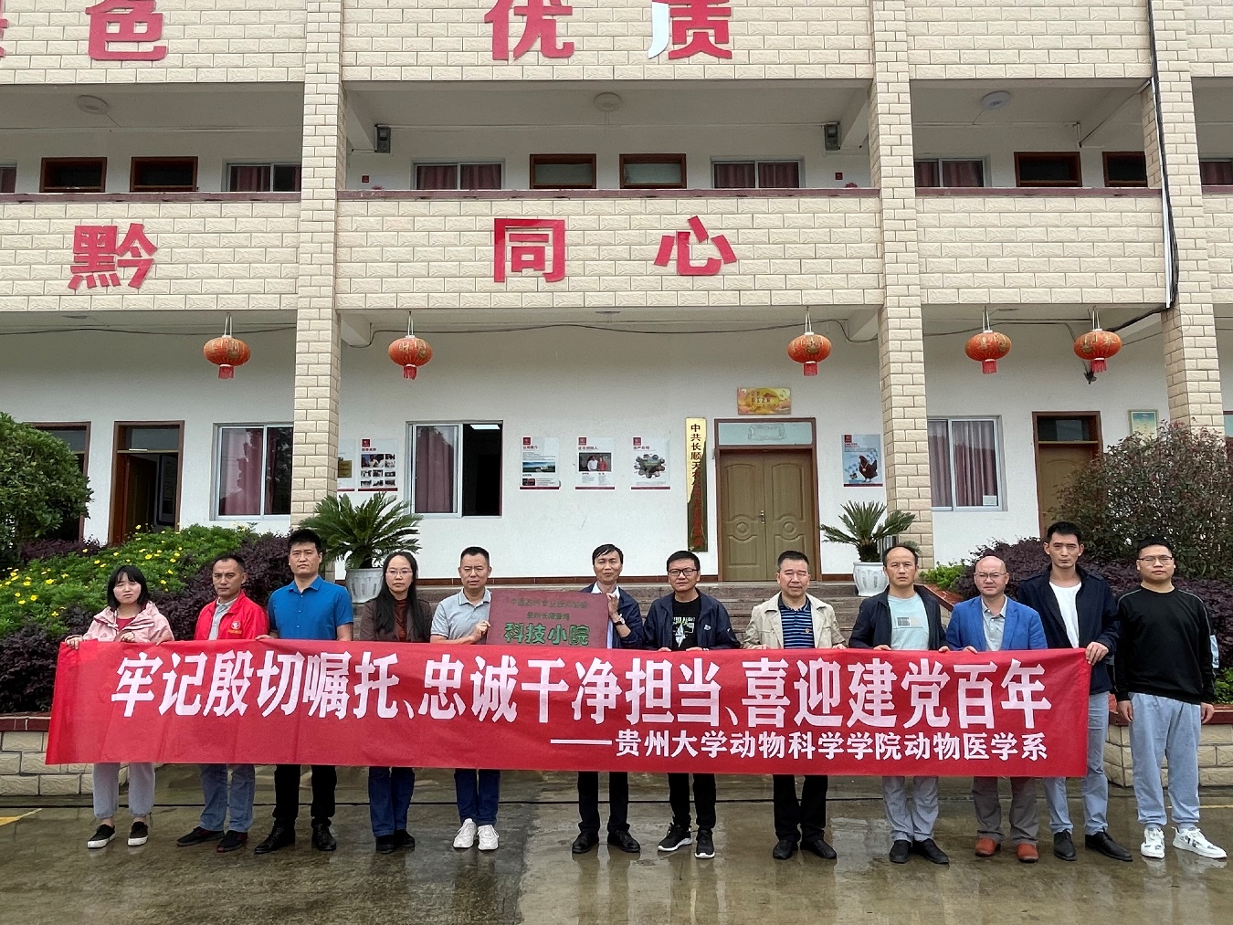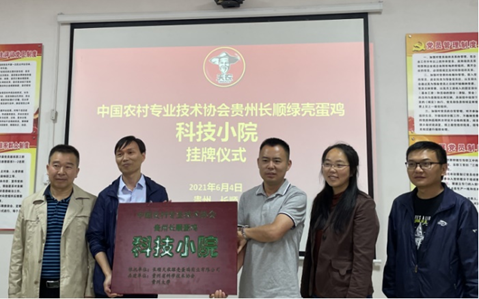 按照校、院党委“牢记殷切嘱托、忠诚干净担当、喜迎建党百年”专题教育实施方案要求,为了深入推进“我为群众办实事”实践活动,助力乡村振兴,2021年6月4日,动物科学学院动物医学系教工党支部党员、系主任程振涛教授及系副主任温贵兰教授带领“博士村长”学生赴长顺县天农绿壳蛋鸡实业有限公司举行中国农村专业技术协会贵州长顺绿壳蛋鸡科技小院挂牌仪式及开展技术培训,同行的有黔南州农业农村局、长顺县科协及农业农村局相关领导及专业技术人员,长顺天农公司负责人参加挂牌仪式。