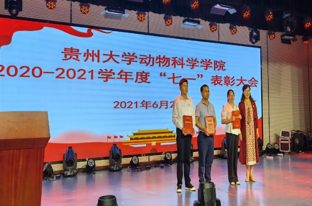 随后陈超宣读了学院表彰决定——《中共贵州大学动物科学学院委员会关于表彰2020-2021学年优秀共产党员、优秀党务工作者、先进党支部和优秀主题党日活动的决定》,出席大会的领导分别为获奖集体和个人颁发了荣誉证书。
