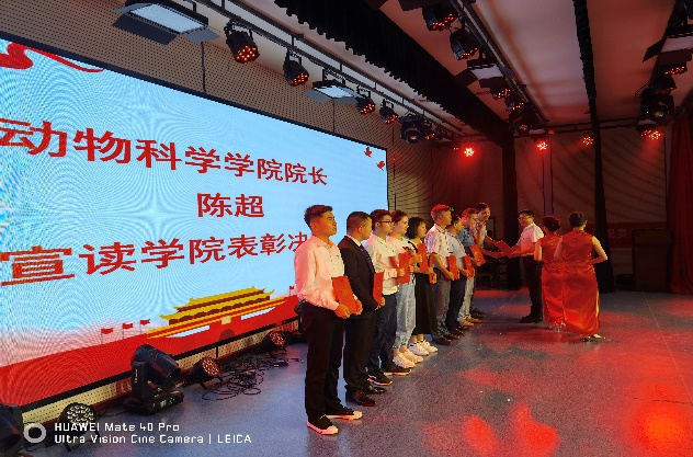 为深入开展党史学习教育和“牢记殷切嘱托、忠诚干净担当、喜迎建党百年”专题教育,营造浓郁氛围庆祝建党百年,2021年 6月21日晚7点,动物科学学院在西校区崇实楼110室举行庆祝中国共产党建党100周年暨“七一”表彰大会。院党委书记罗聃宁,副书记、院长陈超,副书记李秋蓉,副院长陈祥出席会议,副院长欧德渊列席会议,学院全体师生党员、入党积极分子300余人参加大会,会议由陈祥同志主持。