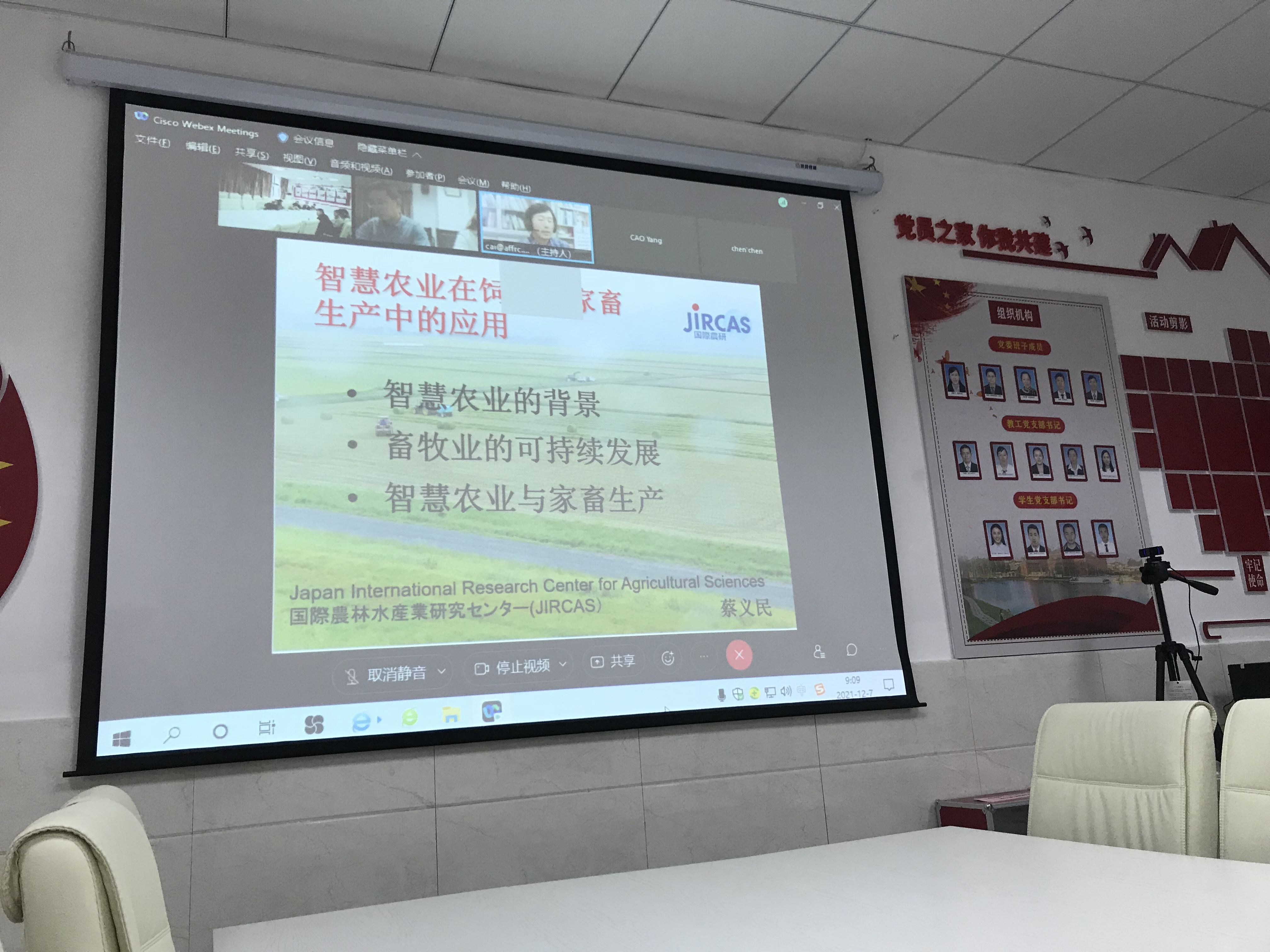 2021年12月7日上午9点,动物科学学院崇学楼206会议室内,草学硕士点全体教师和研究生如期参加了重基础、促提升、小草大讲堂系列活动。本次活动陈超院长邀请到日本国际农林水产业研究中心主任蔡义民研究员(教授)为我系师生作题为《智慧农业在饲料及家畜生产中的应用》线上报告。