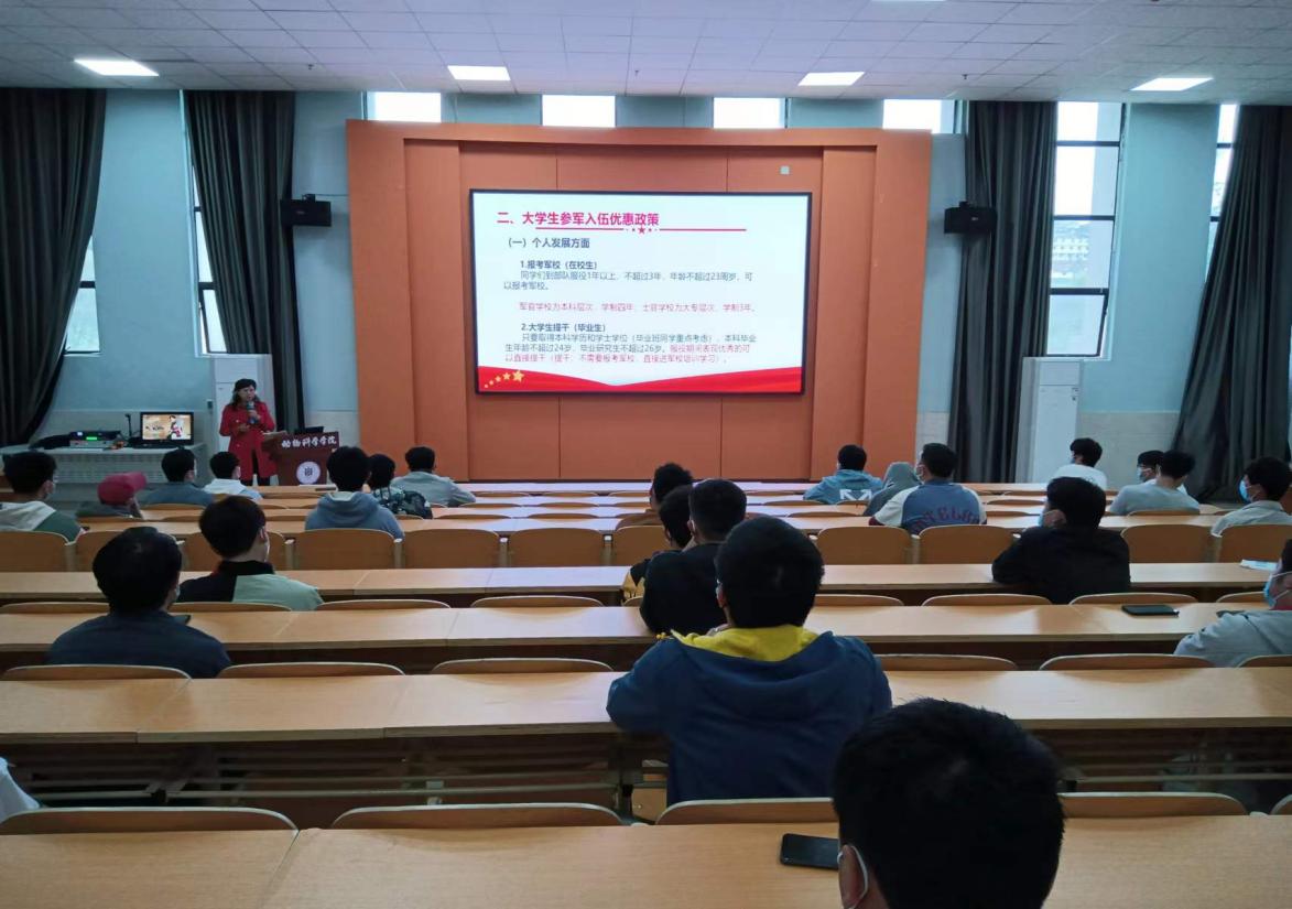 接着,罗聃宁结合贵州大学实际,详细介绍了动科院近两年的征兵情况、大学生参军入伍的优惠政策、贵州大学学生应征入伍优抚优待办法。她结合之前学生参军事例,时而剖析,时谈感悟,把入伍政策装进学生脑海里和心坎上,用心用情打动学生,希望学生心怀祖国,面向未来,谋划好自己的职业生涯之路,尽参军义务,戍边保卫国防。