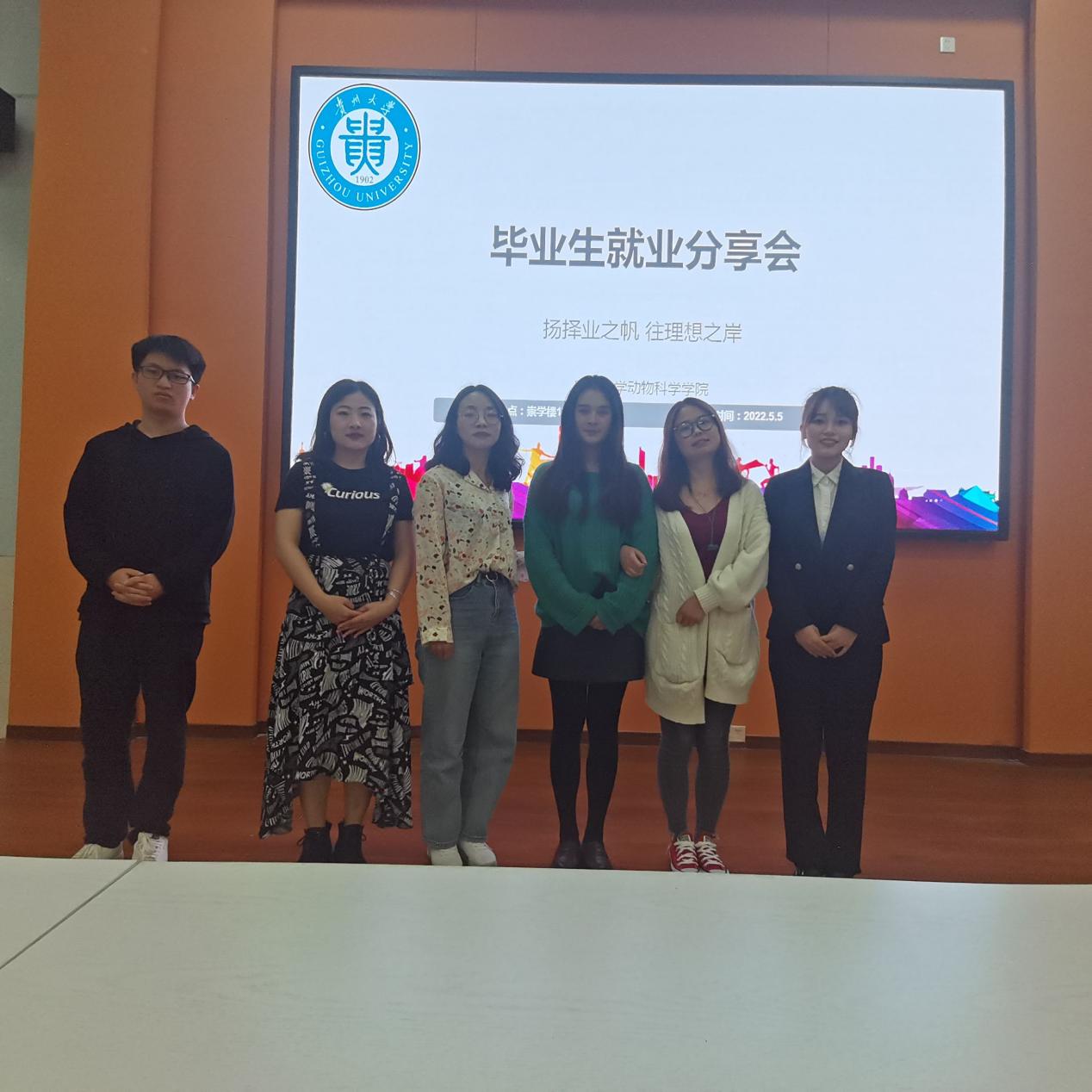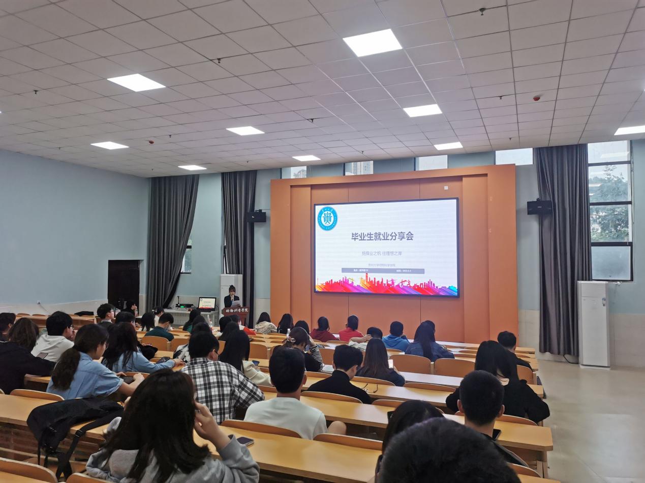 卢青首先介绍了4名毕业研究生升学及就业的情况,随后4名同学分别进行分享。首先由赵鑫同学分享其考取博士研究生的备考经验,他详细介绍了博士研究生招录考试中的笔试及面试环节需要注意的事项;随后成功考取黔南州综合岗位的陈静同学从招聘信息、单位报考、前期准备工作等方面对选调考试进行了细致全面地讲解,并提倡大家平时要多关注时政热点;紧接着宋林锦同学就自身备考选调生的经验及笔试技巧进行了分享,他建议大家要多练习真题,孰能生巧,并就如何准备结构化面试等方面分享了心得;最后分享的是考上公务员的王燕碧同学,她重点对公务员面试考试环节进行介绍,她强调在面试中要注重仪表礼貌,以内容为主,增强互动,回答问题时要条理清晰,从容不迫。