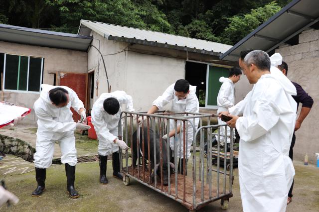 在铜仁市畜牧技术推广站副站长冉隆权高级畜牧师、江口县农业农村局孟华高级畜牧师、江口县双江镇凉风湾天然养殖专业合作社杨志成董事长的共同协作下,贵州大学生猪团队共采集了55头纯种江口萝卜猪的耳组织样品,测量了每头猪对应的体尺体重指标,收集其生长日龄和繁殖性能等记录数据,同时,对每头猪的外貌特征进行摄像,并上传至畜禽遗传资源管理精准采样大数据平台,此次工作对摸清江口萝卜猪资源现状、推进其资源保护与利用具有重要意义。