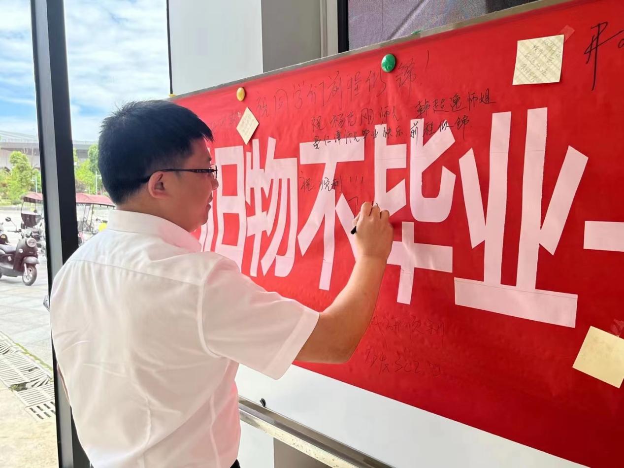 “祝同学们前程似锦”、“祝顺利”、“祝福各位师兄师姐工作顺利”......活动中,动物科学学院院长陈超带领学院师生到活动现场在条幅上为毕业生写下离别的话语,送出最真挚的祝福。
