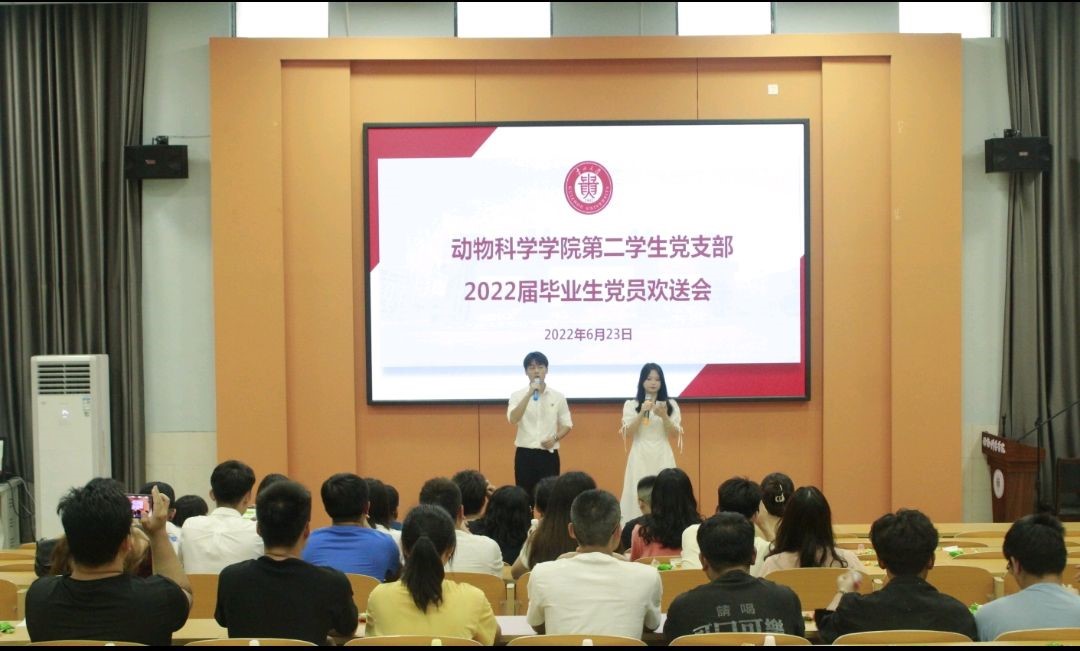 为欢送并勉励毕业生党员,动物科学学院第二学生党支部于2022年6月23日晚在崇学楼131报告厅举办了“青春共奋斗,欢聚话别离”主题党日活动,党支部书记聂江昱菡、及学生支部全体党员共计50余人参加,本次活动由支部党员洪兴和袁茂莎主持。