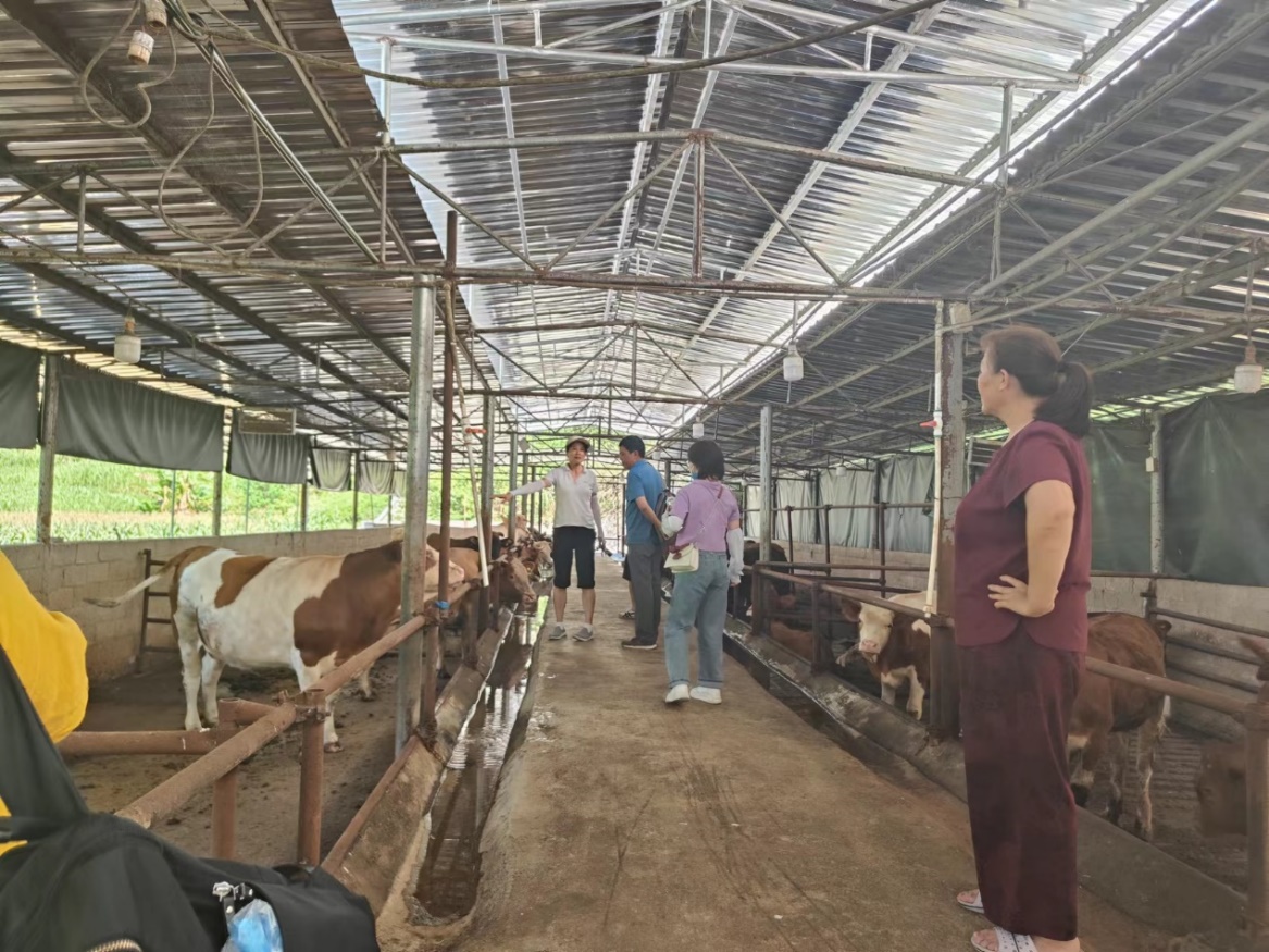 周碧君一行依次参观了贵大科研养牛基地、有机肥实验场及当地养殖户肉牛圈舍,对坳田村肉牛养殖基地牛体健康情况、粪污处理情况及圈舍卫生情况充分了解后,提出调整贵大科研养牛基地肉牛饲喂配方,以促进肉牛增重;同时,针对牛圈卫生不达标情况,建议养殖户要定时清理圈舍粪便,陈旧污迹用高压水枪冲洗,牛体粪便先喷水后刮取,饲喂期间不定时清理圈舍,保持圈舍卫生。