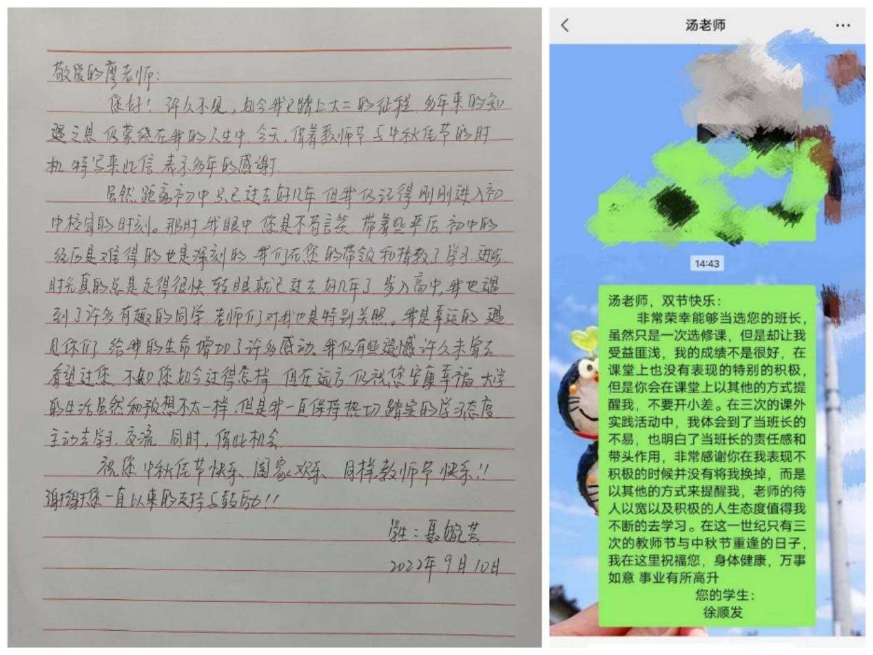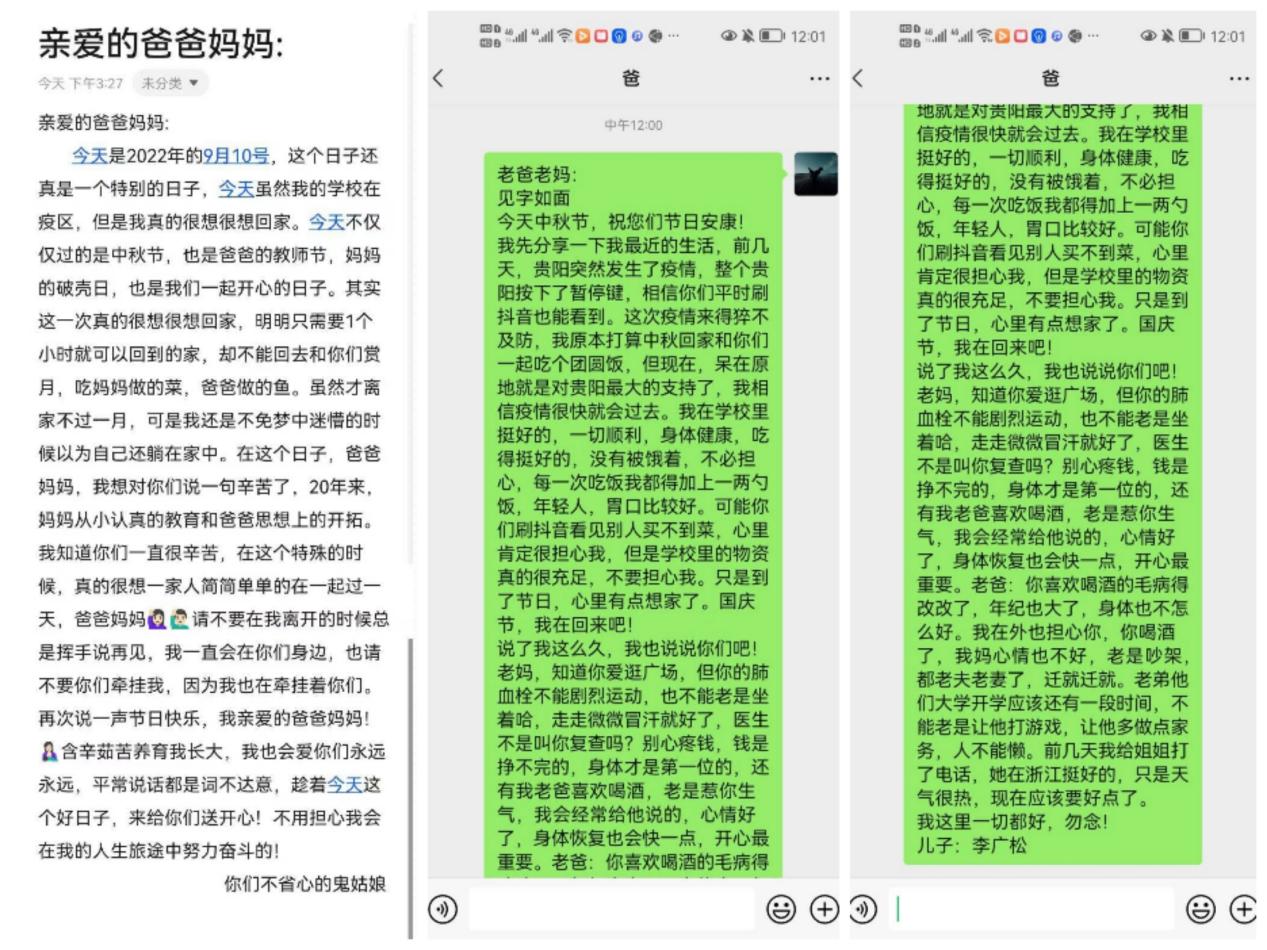 活动分为两个板块,第一个板块的主题是“一颗真心两封信”。一颗真心是指同学本人的真诚的心。两封信是指分别给父母和老师写信。同学们热情很高,积极报名参加活动,纷纷拿写手机和笔,在中秋节和教师节相遇的日子里,主动给父母和老师发感恩信息,以此来表达自己对父母、对老师的真挚的感恩之情。