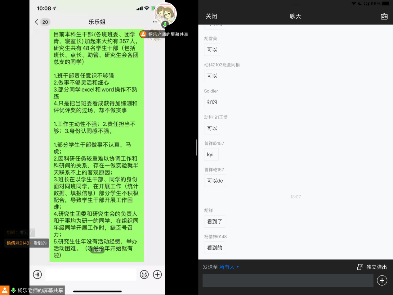 杨乐副书记向全体学生干部提出三点要求:一是充分认识党的二十大召开的重要意义,积极学习习近平总书记围绕青年工作发表的一系列重要论述,进一步明确新形势下自身的成长道路和历史使命;二是结合学校疫情防控政策,提升疫情防控意识和执行力;三是每一名学生干部都应认真思考“为什么做学生干部”“做一名怎样的学生干部”和“今后如何改进工作方法和提升工作效果”等问题。