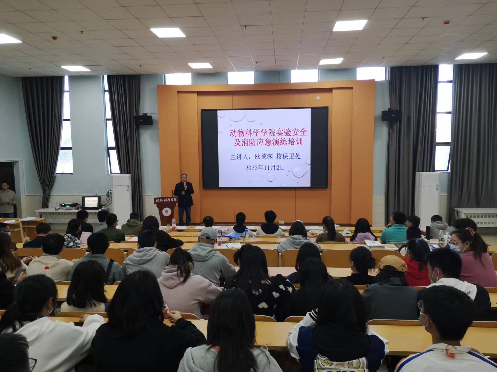演练前学院副院长欧德渊对到场教职工、研究生及本科生进行了实验室安全知识培训。欧德渊在培训中要求全院师生要增强安全意识,严格按照实验室制度及仪器设备操作规范开展工作;要加强实验室安全隐患排查,在开展实验教学及科研工作前先进行风险评估,经实验室主任、教研室主任及专家组评估后才能开展相关工作。