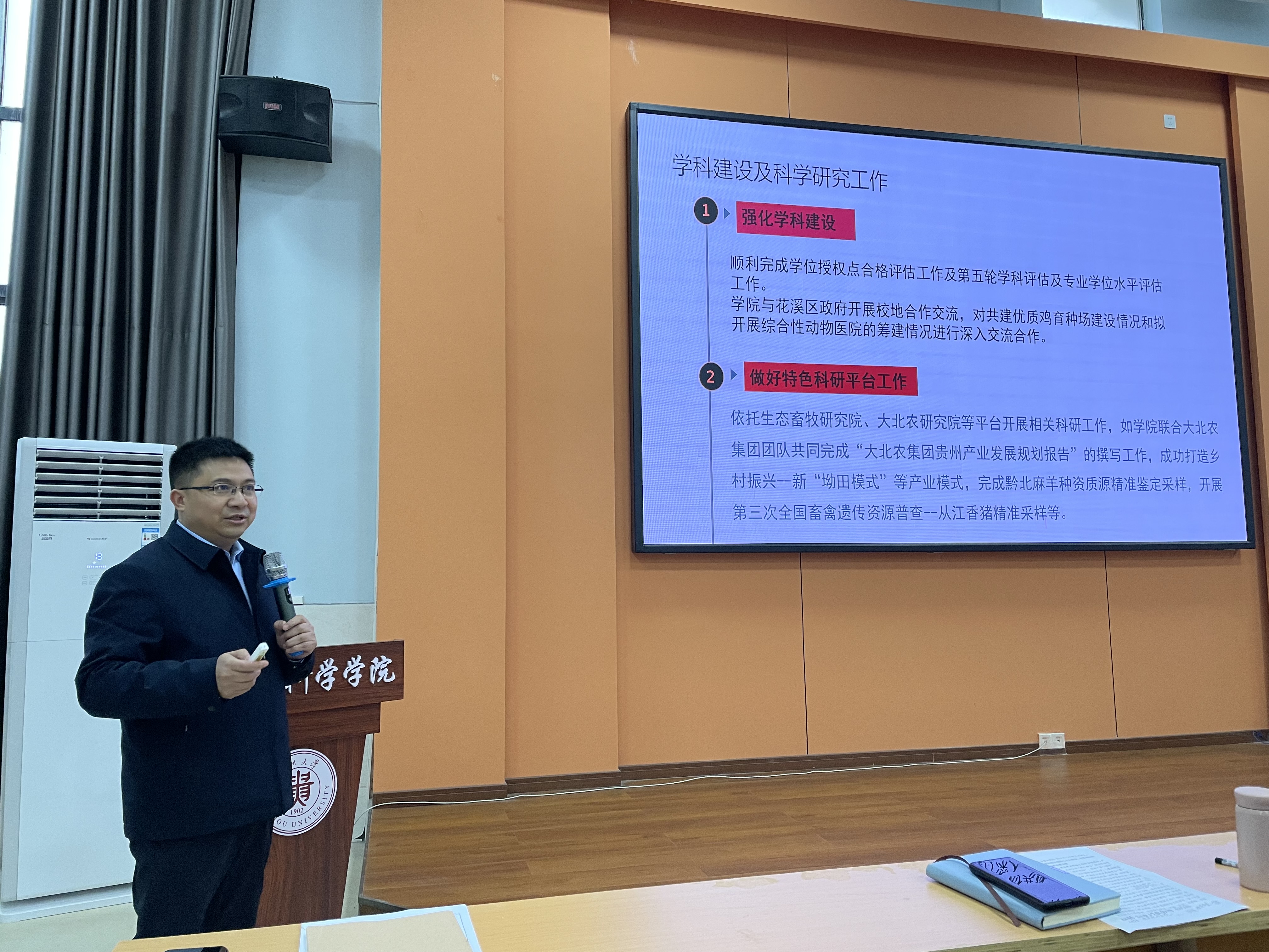会议审议并通过了陈超所作的院长工作报告及财务工作报告。陈超在报告中总结了学院2022年在学科建设、人才引进、科学研究等方面所取得的成绩,安排部署2023年基金申报、学科竞赛等相关事宜。他谈到,2022年学院在各方面取得了好的成绩,如在学校高质量考核中获得了A等的好成绩,动物医学、草业科学两个专业进入国家一流专业建设点等,新的一年,学院将立足实际,落实立德树人根本任务,全面提升教育教学质量、研究生科研能力,抓好学科建设及科学研究,加大高层次人才引进力度,增强社会服务能力,切实提升学院办学实力和核心竞争力,为学校高质量发展添砖加瓦。