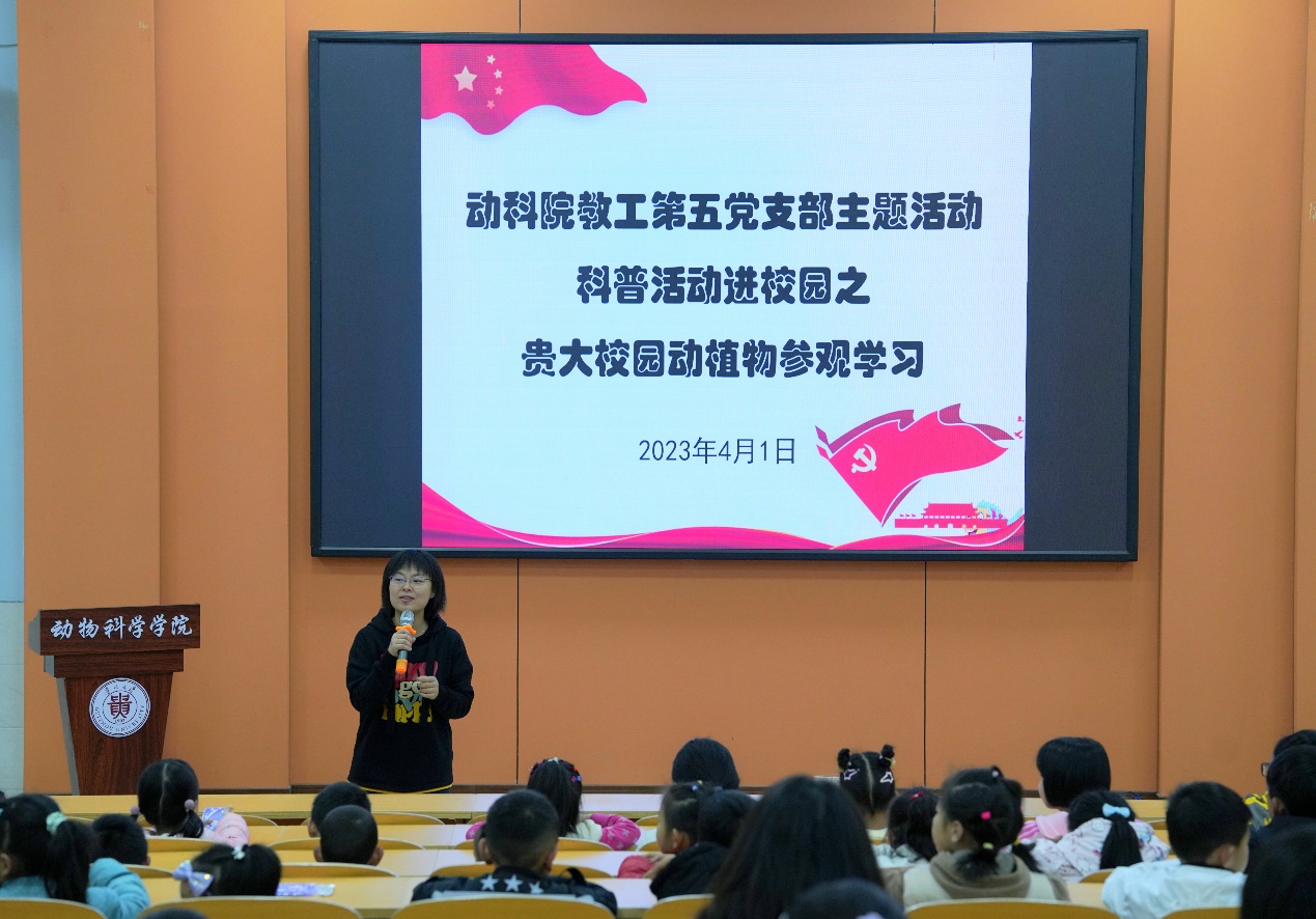 为深入贯彻落实党的二十大精神,认真学习贯彻习近平总书记关于弘扬雷锋精神的重要论述和对深入开展学雷锋活动的重要指示精神,4月1日,动物科学学院关工委及教工第五党支部在崇学楼131报告厅举办了科普活动进校园系列之——贵州大学校园动植物参观学习活动。院党委副书记、院关工委主任杨乐、教工第五党支部部分党员教师、水产及草业专业部分研究生、贵阳一中星辰学校和贵阳第二实验小学的部分小学生及部分教职工子女参加了此次活动。