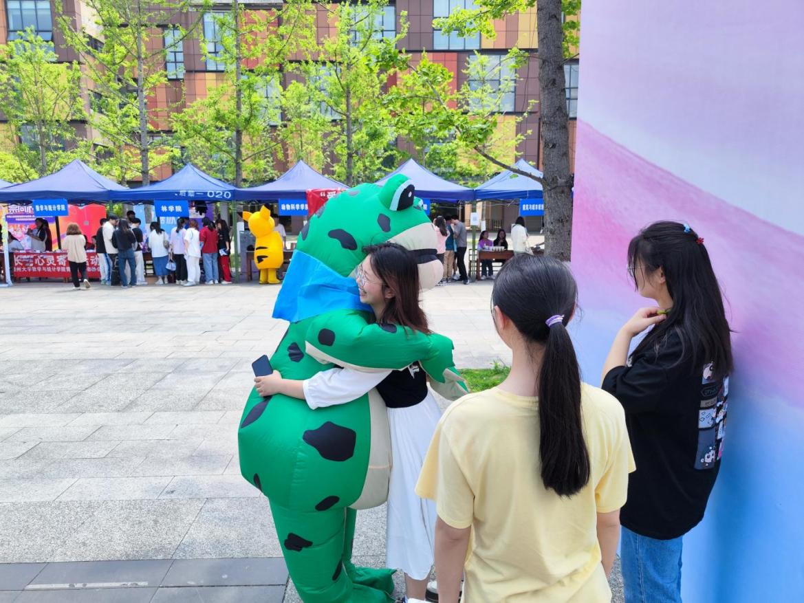 卡通人物吸引了路过的同学们,大家放下拘束和尴尬,纷纷参与进来,张开双臂,拥抱他人,拥抱自己。友善的拥抱增加了同学之间的信任,缓解了负面情绪,让他们在爱的拥抱中感受无处不在的关爱。