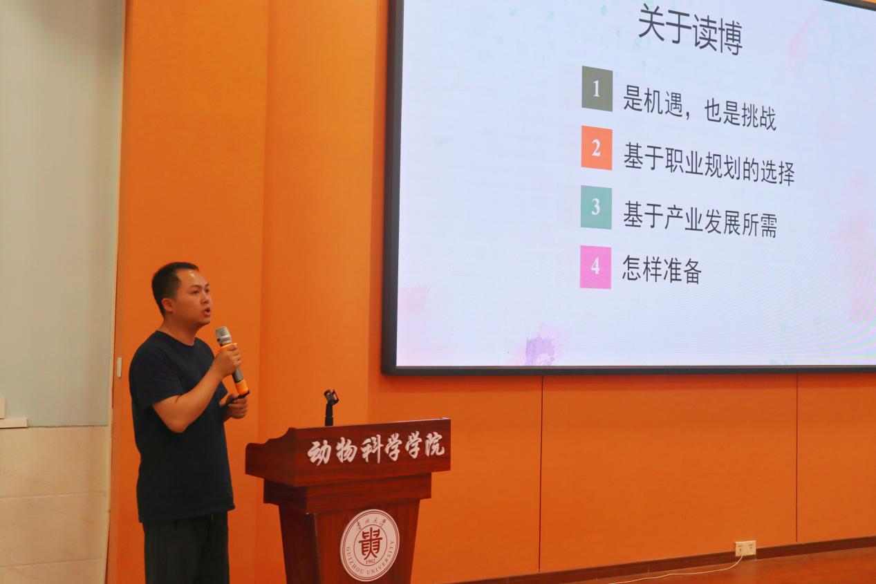 畜牧学博士生田宇杰同志分享了自身的职业规划及考博之路。他从博士申请的时间节点、导师联系、考核准备等方面详细地介绍了自己申博的经历。他建议,多与导师进行沟通,在研一研二多注重论文、项目、奖项的积累,提升自己的竞争力。
