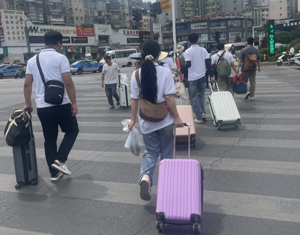 随后,实践队出发前往松桃县乌罗镇。在车门打开的瞬间,队员们便迅速行动起来,按照事先分工有条不紊地搬运着行李与物资。烈日当空,不一会儿,汗水就浸透了大家的衣衫,但每个人脸上都洋溢着期待与热情,丝毫未受高温影响。