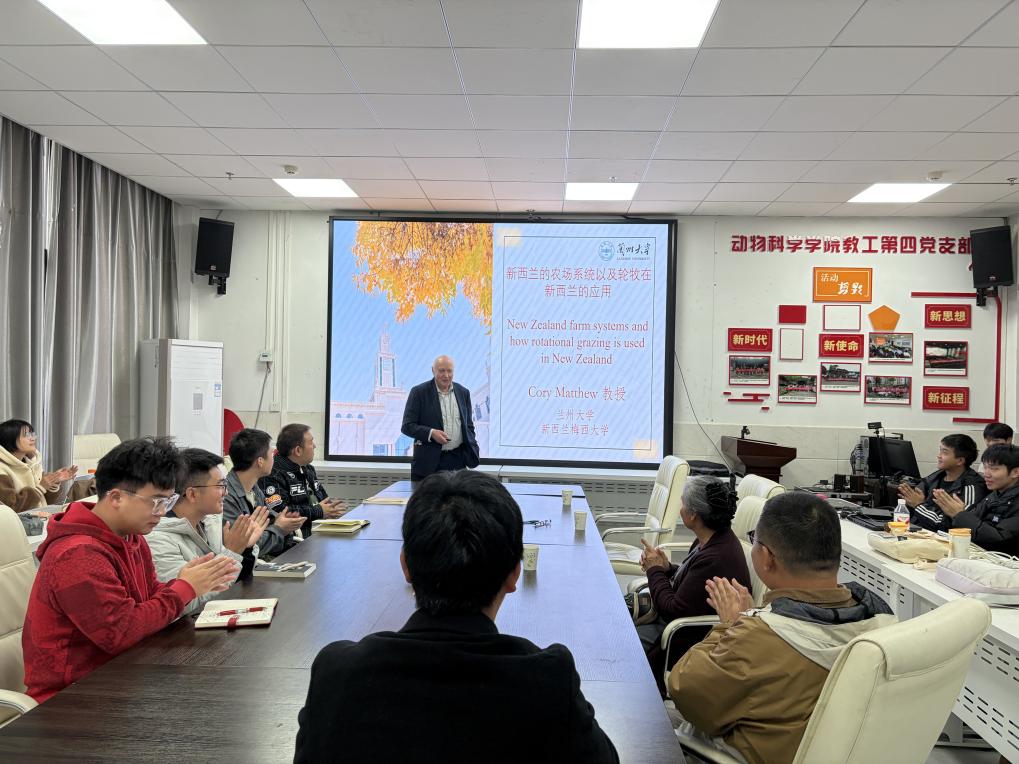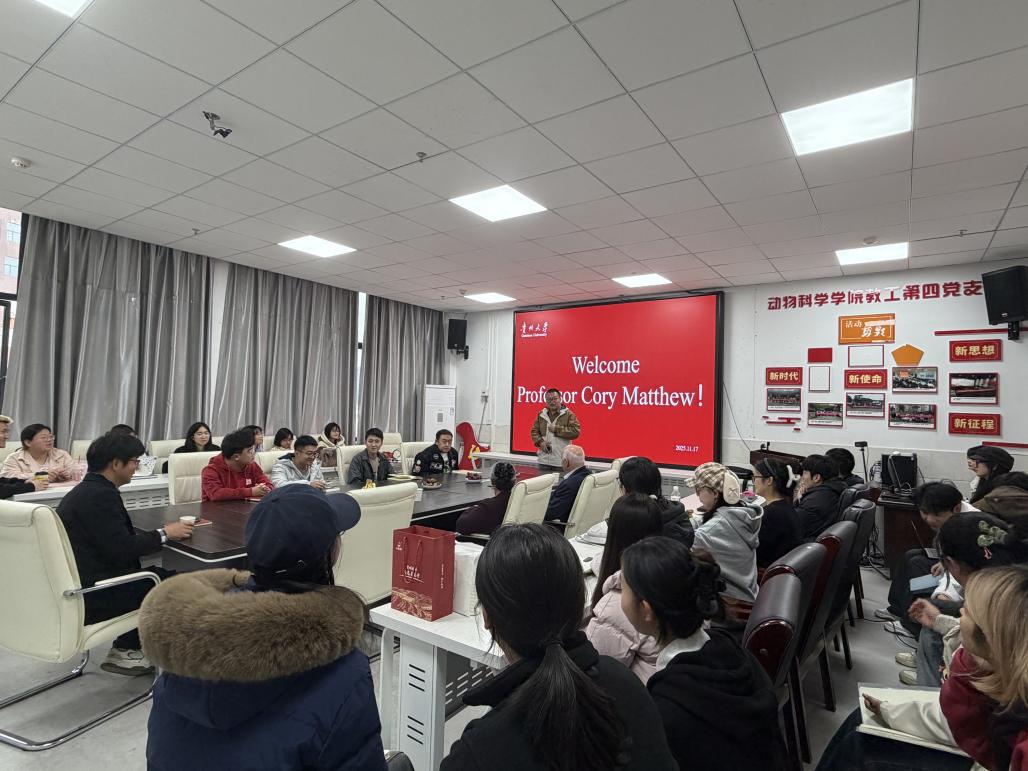 2025年11月17日下午,国际著名草地科学家、兰州大学草地农业科技学院教授Cory Matthew应邀在贵州大学崇学楼519会议室作题为《Farm system evolution on New Zealand hill country sheep and beef farms, 1980–2010》的学术报告。本次报告吸引了众多师生前来学习,现场学术氛围浓厚。