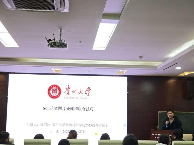 拥有3篇SCI论文发表经历、获校级三好学生荣誉的2023级兽医专业研究生梁绍波,聚焦科研实操中的痛点问题,以“SCI论文图片处理和组合技巧”为主要内容与同学们交流心得。他向参会同学详细讲解了图片处理的三大核心技巧,一是原始数据的规范采集,强调“拍摄参数统一、标注清晰”是基础;二是软件工具的高效运用,重点演示了ImageJ、GraphPad Prism等绘图软件的功能,分享“分层叠加”“颜色校正”等实用操作;三是组会汇报的适配调整,针对不同汇报场景,提出“简化冗余信息、突出核心结论”的设计方法。