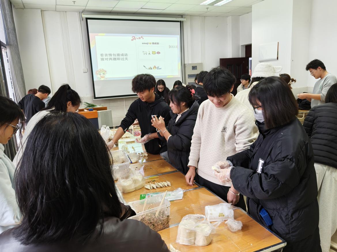 随后,包饺子环节正式开始。师生们热情参与,各展其能,包出的饺子形状多样,既有传统样式,也不乏云吞、包子形状等创意造型,现场气氛轻松欢快。同时进行的看图猜词游戏也吸引了大家踊跃参与,主持人展示趣味图片,同学们踊跃抢答,猜对的同学收获了精美的小奖品,现场欢呼声、喝彩声此起彼伏。