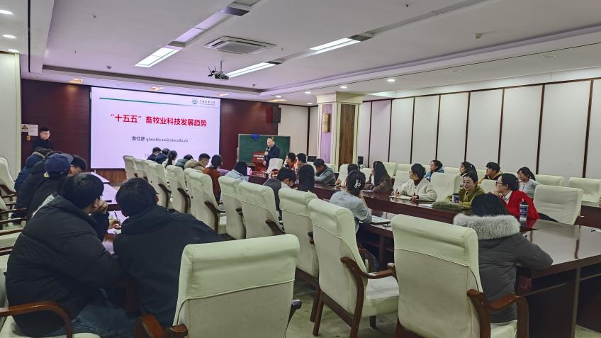 1月8日下午,中国工程院院士、贵州大学动物科学学院名誉院长谯仕彦教授在崇学楼324会议室为我院师生做题为“‘十五五’畜牧业科技发展趋势”的学术专题讲座。讲座由动物科学学院党委书记陈超教授主持,动物科学学院院长程安春教授及学院五十余名师生聆听专题讲座。