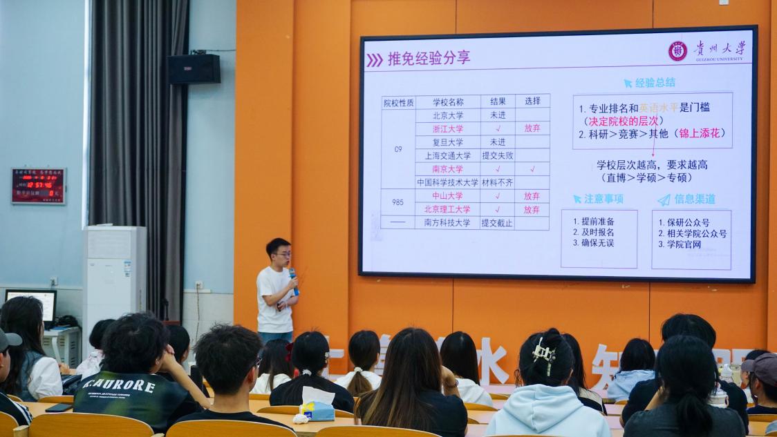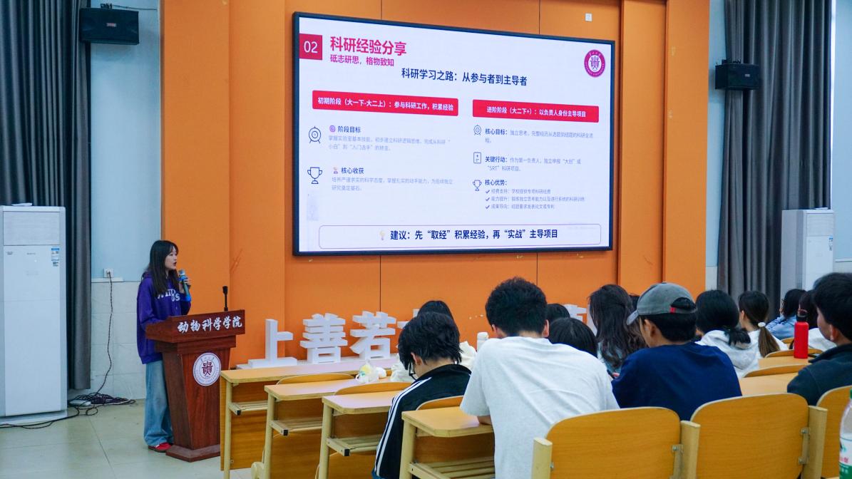 保研至南京大学的崔曦同学,围绕学习方法与保研备考,从课程规划、时间管理、院校选择到材料准备等方面,系统分享了保研之路的经验做法;同样保研至南京大学的王甜同学,聚焦学科竞赛,结合自身参赛经历,详细讲解了选题思路、团队协作与作品打磨等实战经验,鼓励同学们以赛促学、以学促行、以行践知;保研至复旦大学的陈薄帆同学,以科研训练为切入点,讲述了从文献研读、实验设计到论文撰写的成长历程,强调科研之路贵在坚守与热爱;保研至中国农业大学的周子楠同学,结合社会实践经历,分享了在科技小院、基层实习中的实践感悟,生动诠释了动科学子把论文写在祖国大地上的责任与情怀。